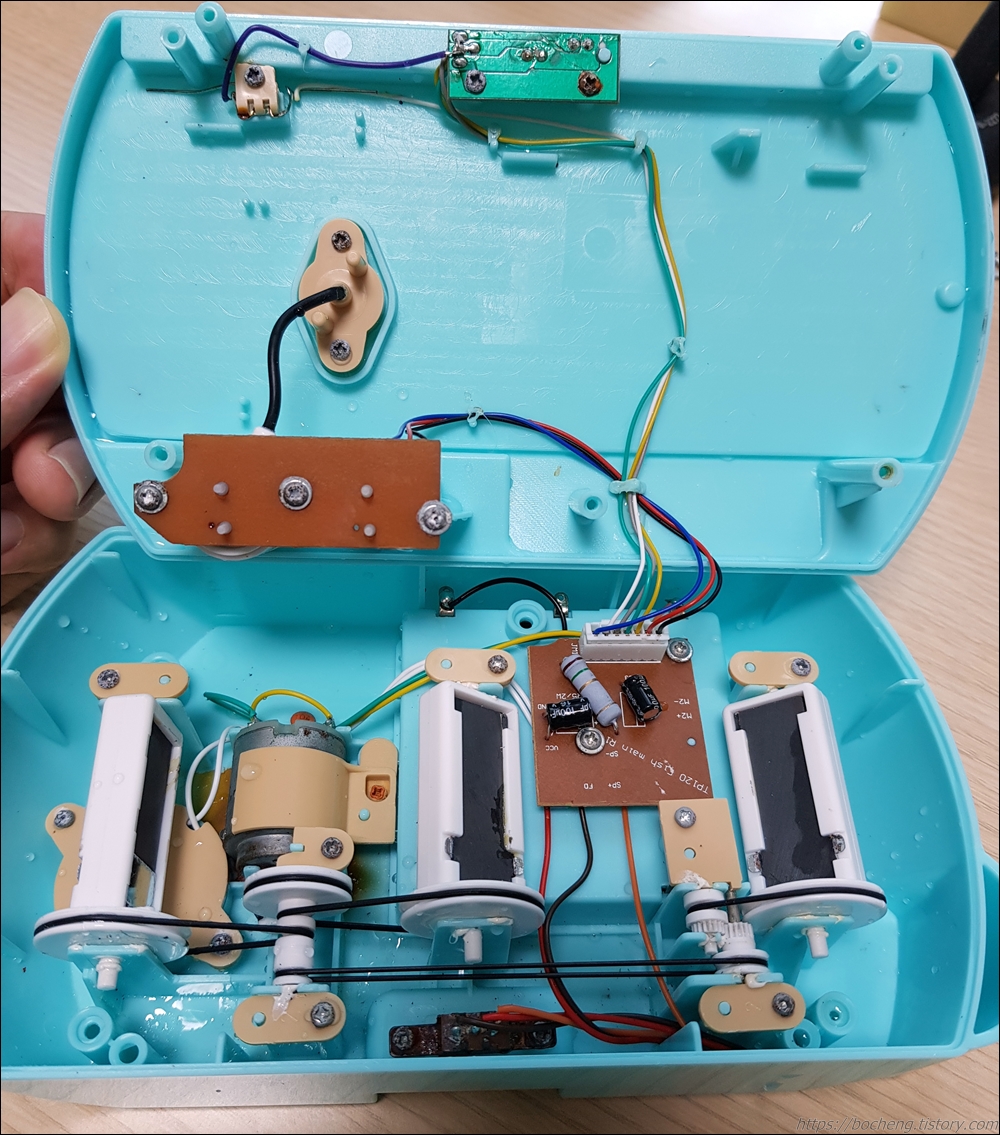 제품을 열어보니 물고기들이 흔들거리는 이유를 알 수 있음.