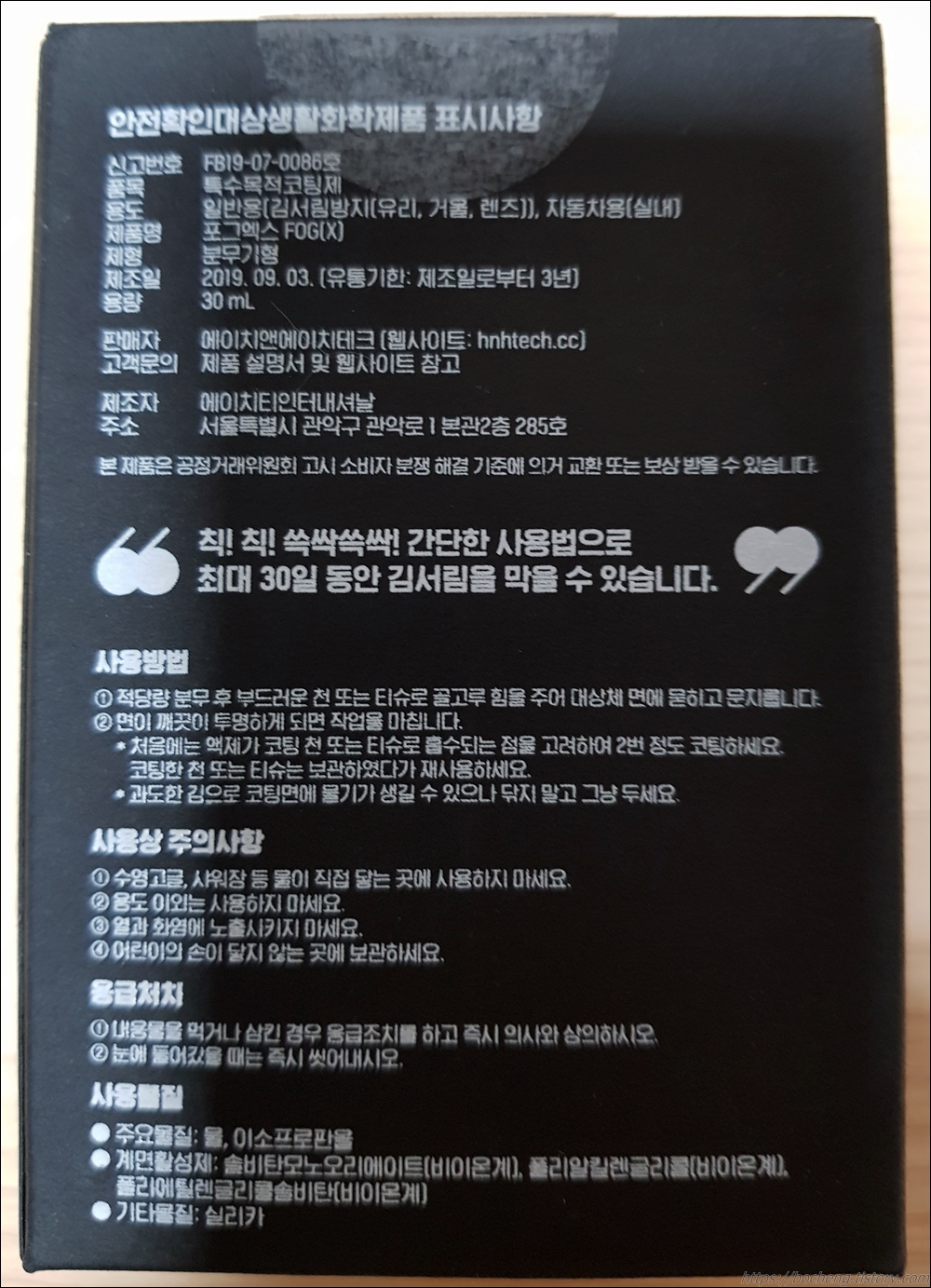 이것저것 검색해보다 걸린 것이 바로 '포그 엑스 김서림 방지제'