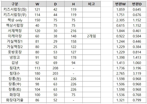 엑셀에 옮겨 놓은 가구 실측을 봅니다.