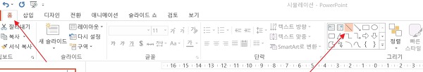 우선 파워포인트의 '홈'의 그리기 메뉴에서 '선'을 선택하여 평면도의 수치가 나와있는 부분에 같은 크기로 그려 줍니다.