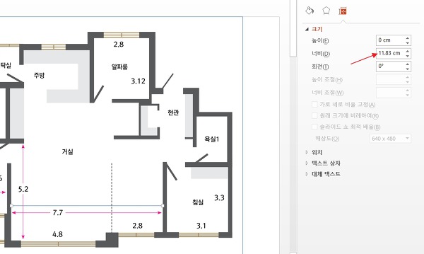 이제 파워포인트에 올려놓은 평면도를 기준으로 실제 길이로 매칭 시켜주는 작업을 해야 합니다.