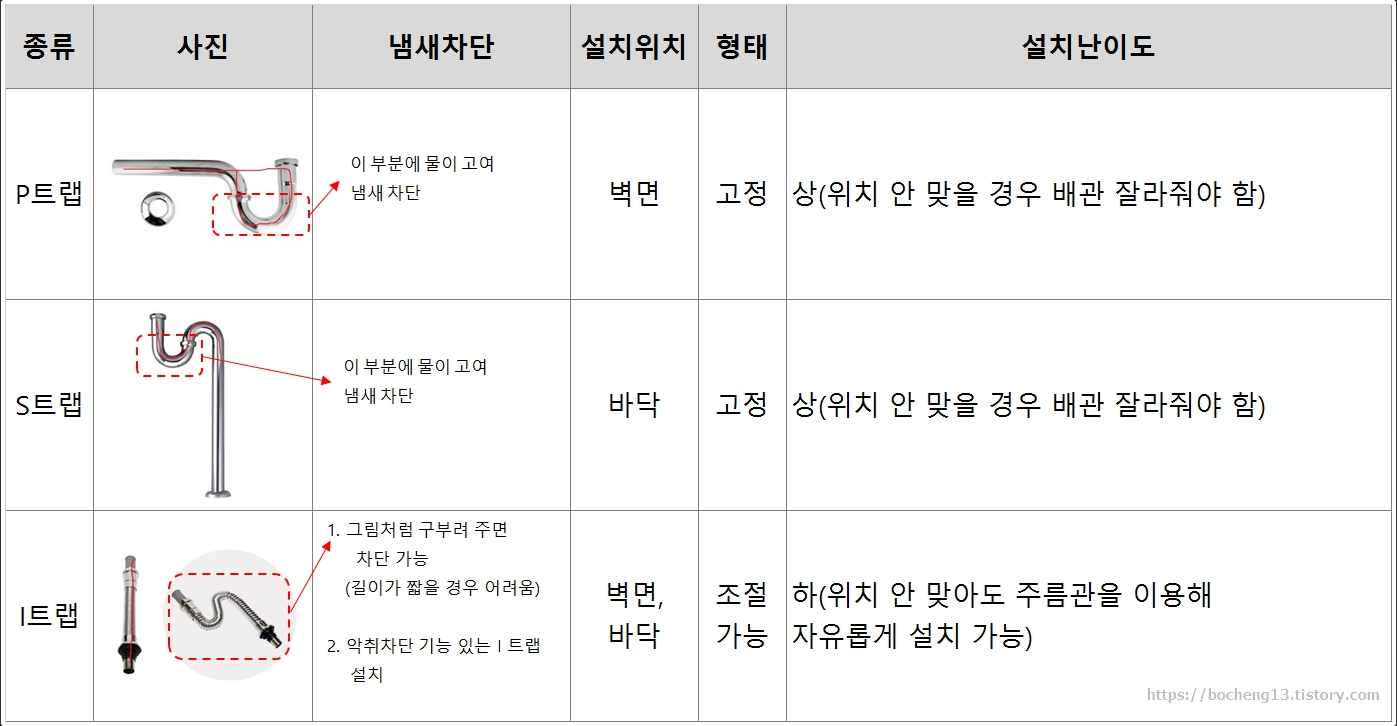 표에 보시는 바와 같이 P트랩과 S트랩은 고여 있는 물로 인해 악취 차단이 가능하니까요.