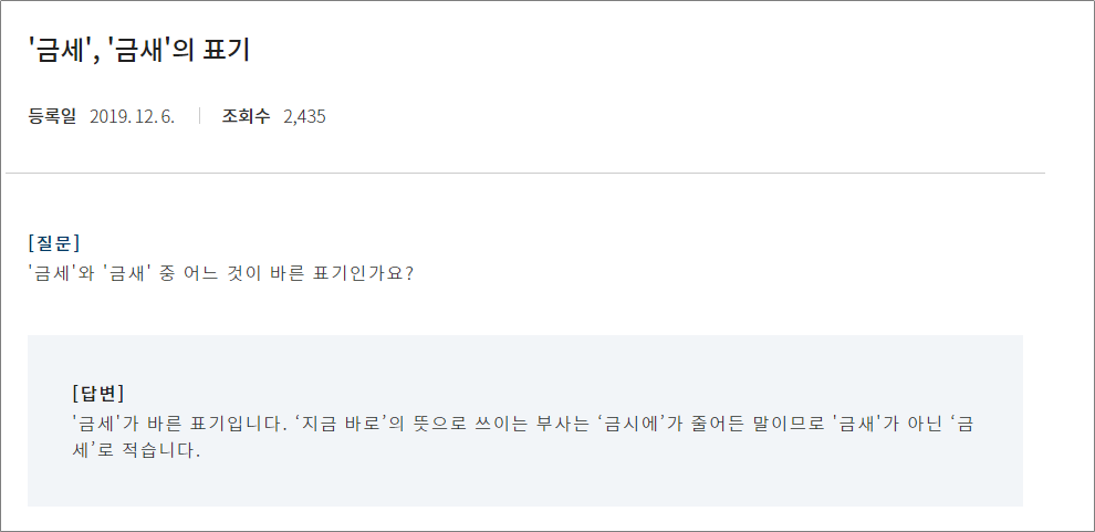 → '금시에'가 줄어서 된 말이므로 '금세'가 맞다고 합니다.