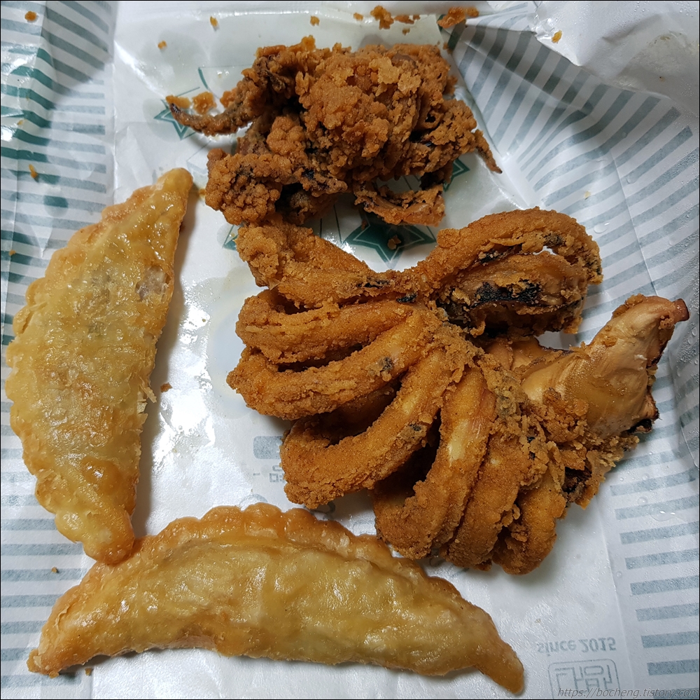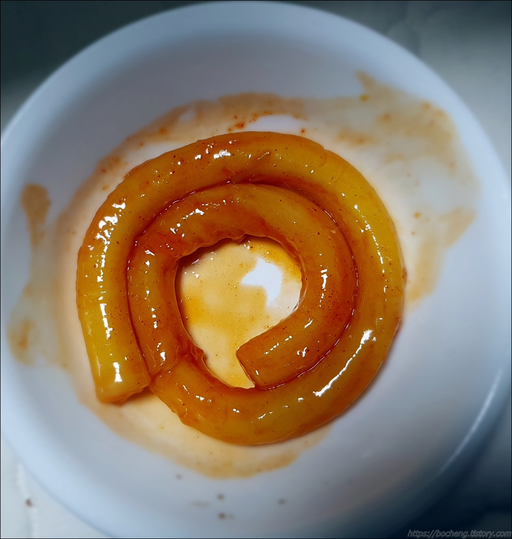 살짝 맛 본 통오징어 튀김은 그냥 먹어도 약간 매콤한 맛이 나는 튀김옷으로 바삭하게 튀겨져 있었습니다.