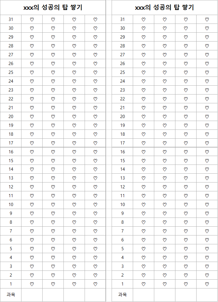 하단에는 매일 공부해야할 과목을 적어주고, 공부를 한 날의 하트에 색칠해가며 하루 하루 쌓아가는 방식.